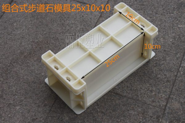 其塑料模具本身的規(guī)格的25x10x10cm,而堵在模具兩邊的堵頭規(guī)格為10x10cm。這樣的設(shè)計主要是對于步道石模具在澆筑成型后脫模過程中較為便利,只需將固定組步道石模具的鎖扣進(jìn)行拆除后,便能較為便利的進(jìn)行模具的脫模,所以麗臣在對著款模具上取名為組合式步道石模具。
